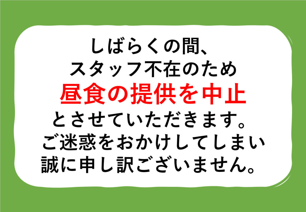 2026.04.06 しばらくの間、調理スタッフ不在のため、食事提供を中止とさせていただきます。 急なご連絡となり、ご迷惑をおかけして大変申し訳ございません。 再開については改めてお知らせいたします。 何卒よろしくお願いいたします。 前へ