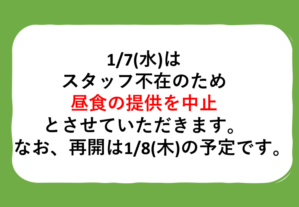 2026.01.06 明日1/7(水)の昼食は調理スタッフの不在のため、中止とさせていただきます。 急な告知となり、ご迷惑をおかけして大変申し訳ございません。 なお、再開は1/8(木)の予定ですがメニューが変更となる可能性がございます。 何卒よろしくお願いいたします。 前へ