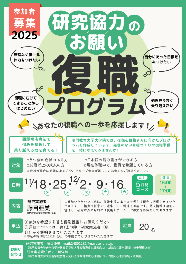 対象者:抑うつ症状を抱えている休職者の方で復職を希望されている方(適応反応症も可能)。