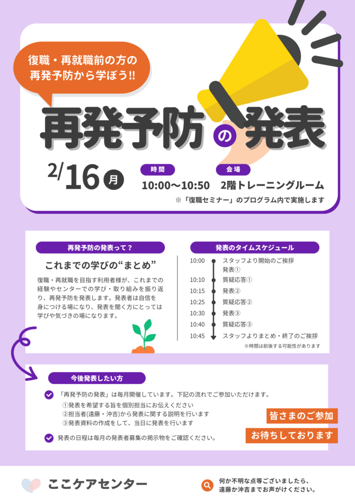 2026.02.13 復職セミナー内で、復職・再就職を目指す利用者様がセンターでの学びを振り返り、自身の再発予防について発表されます。 皆さまのご参加お待ちしております。 日時:2月16日(月)10:00~10:50 場所:名古屋ビル2Fトレーニングルーム 対象:当センター利用者様 前へ