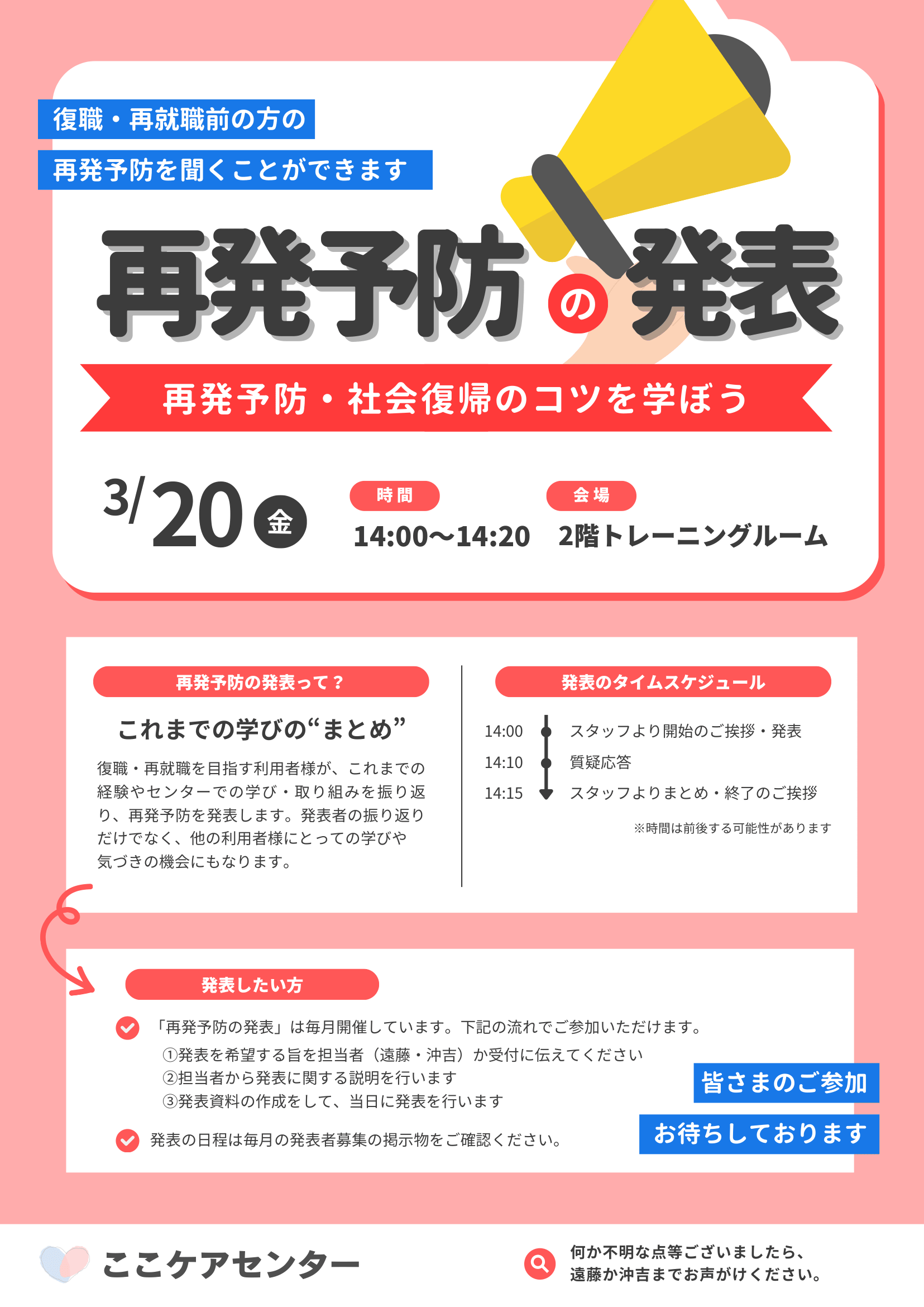 2026.03.18 【再発予防発表会のお知らせ】 復職・再就職を目指す利用者様がセンターでの学びを振り返り、自身の再発予防について発表されます。 皆さまのご参加お待ちしております。 日時:3月20日(金)14:00~14:30 場所:名古屋ビル2Fトレーニングルーム 対象:当センター利用者様 前へ