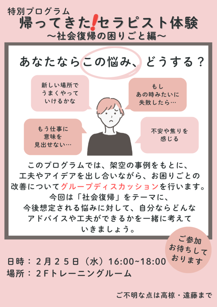2026.02.09 前回好評だった「心理師体験」がより実践的になって戻ってきます! 再就職や復職によくあるお悩みにアプローチしてみましょう! どなたでも参加しやすいプログラムとなっておりますので、皆さまのご参加お待ちしております。 日時:2月25日(水)16:00~18:00 場所:2Fトレーニングルーム 対象者:当センター全利用者様 次へ 前へ