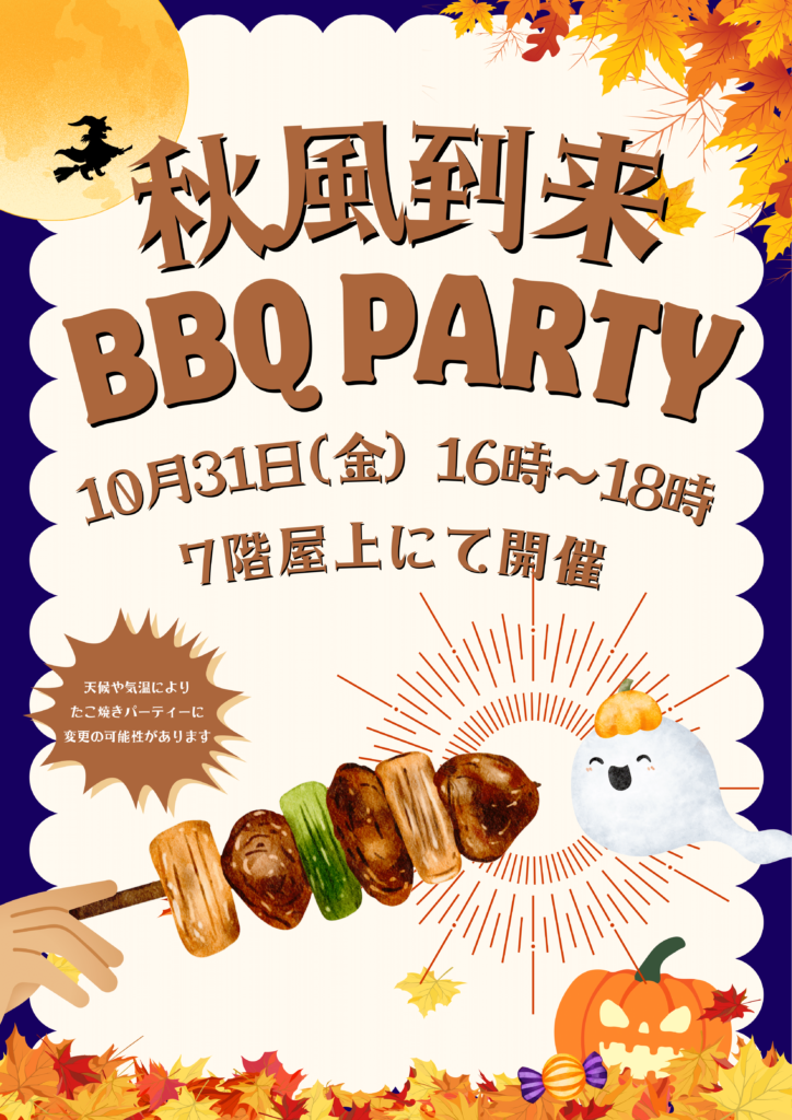 2025.09.30 美味しいお肉と飲み物で秋を味わいましょう。 皆さまのご参加ぜひお待ちしております。 (天候や気温によってたこ焼きパーティーに変更の場合もございます) 日時:10月31日(金)16:00~18:00 場所:CBT名古屋ビル 屋上 前へ