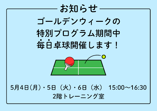 ※期間中、毎日15:00〜16:30に卓球を開催しております。