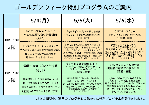 5/4(月)~5/6(水)まで特別プログラムとなり、通常のプログラムはすべてお休みとなります。